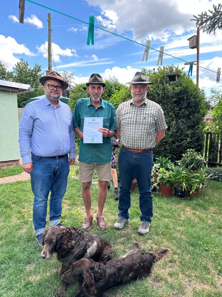 Am 25.6.2025 konnten wir unserem langjährigen Mitglied Arno Schöne den Ehrenbruch des Vereins für deutsche Wachtel Hunde e.V. überreichen. Dieser war Arno im Rahmen der Hauptversammlung des Vereins in Regen 2025 verliehen worden. Mit dem Bruch werden besondere Verdienste um den Wachtelhund gewürdigt. Ramon Uhle, Gerald Scholz Landesgruppenvorsitzender a.i.